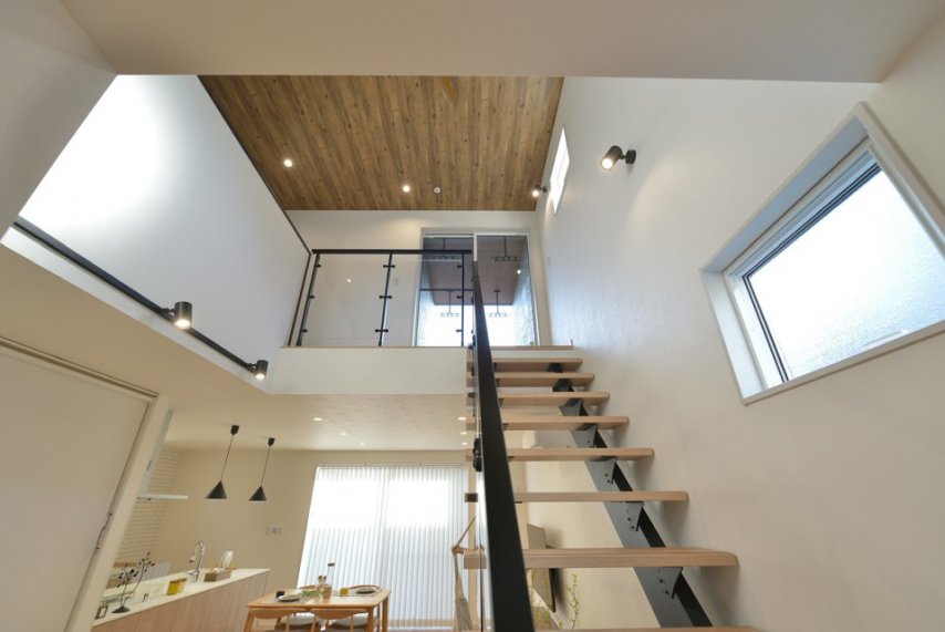 吹き抜けと階段の壁をパネルタイプにしたところですかね♪